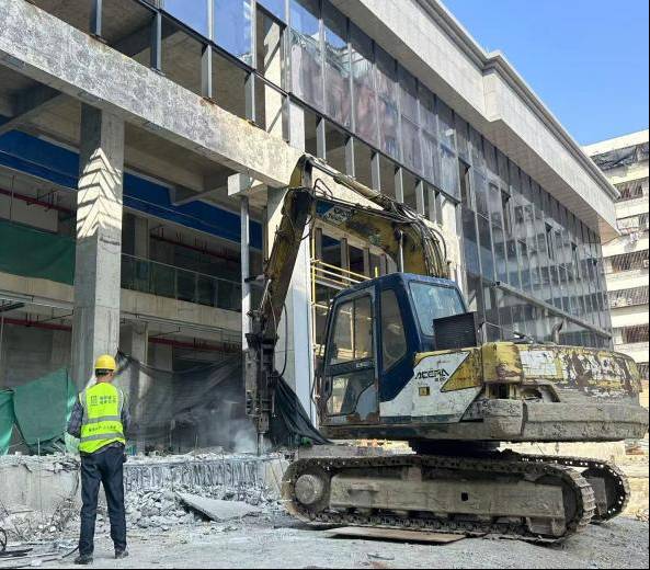 在“金葉匯”商業(yè)綜合體項(xiàng)目現(xiàn)場,玻璃幕墻安裝已封頂,工人正在對塔吊承臺(tái)進(jìn)行破除,后續(xù)將做好公共區(qū)域裝飾裝修、機(jī)電安裝等收尾工作,沖刺全面竣工驗(yàn)收節(jié)點(diǎn)。